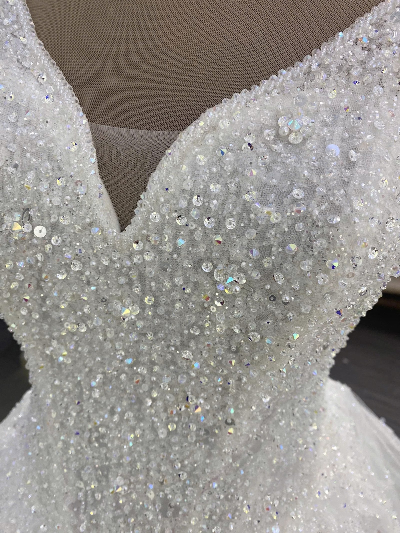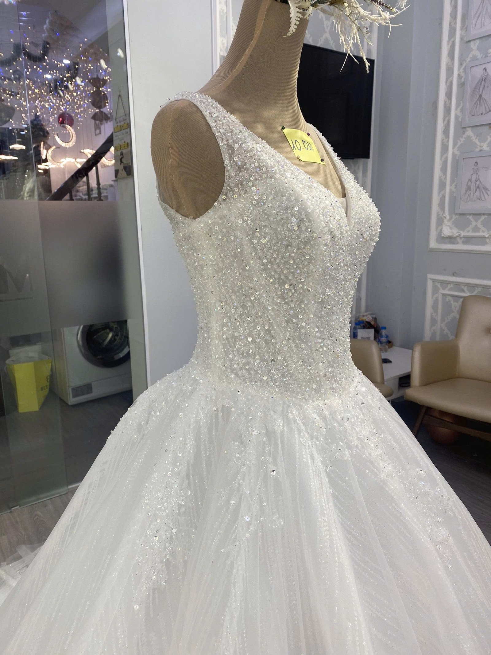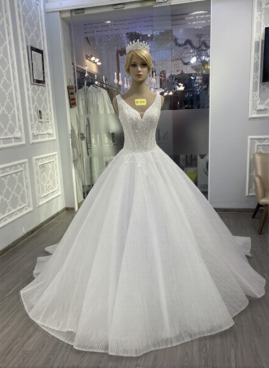 “A dress with a graceful V-neck; designed from high-quality and sparkling glitter material. Can be designed according to measurements or available sizes.”