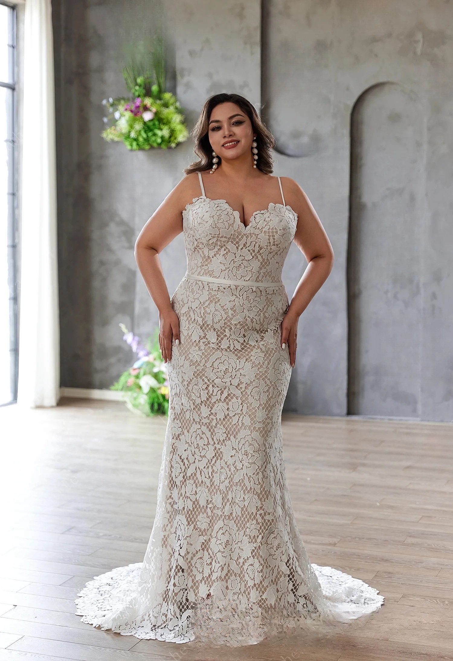 For the bride who adores timeless romance, it is a dream come true. Sweetheart neckline highlight your grace, while the allover flower lace creates a soft, ethereal vibe. Delicate spaghetti straps and detachable long sleeves can be left on or removed. The fitted silhouette hugs your curves beautifully, leading to a trailing lace train. Walk down the aisle in this gown and let your bliss bloom in clad elegance lace.- Friendly reminder, this style has a detachable jacket with train available to purchase separately.
