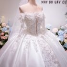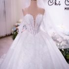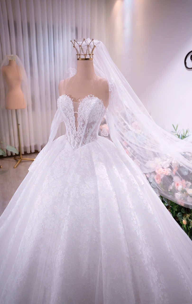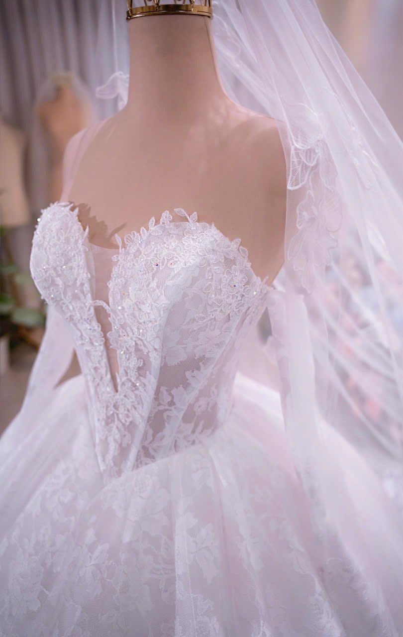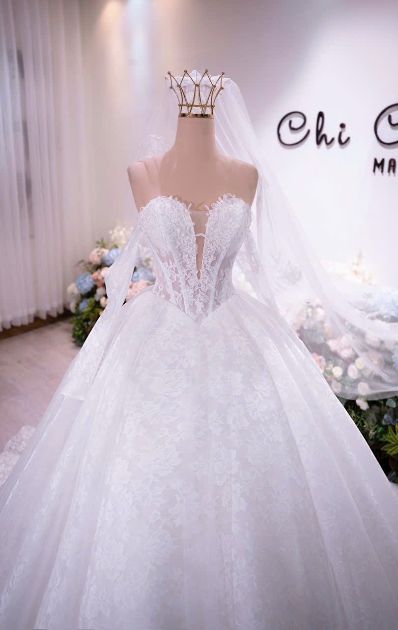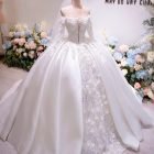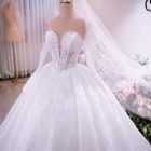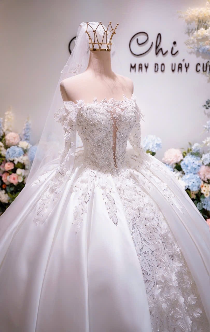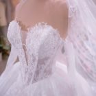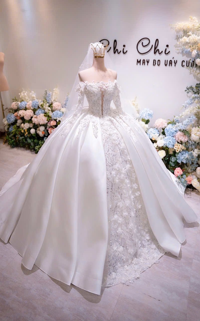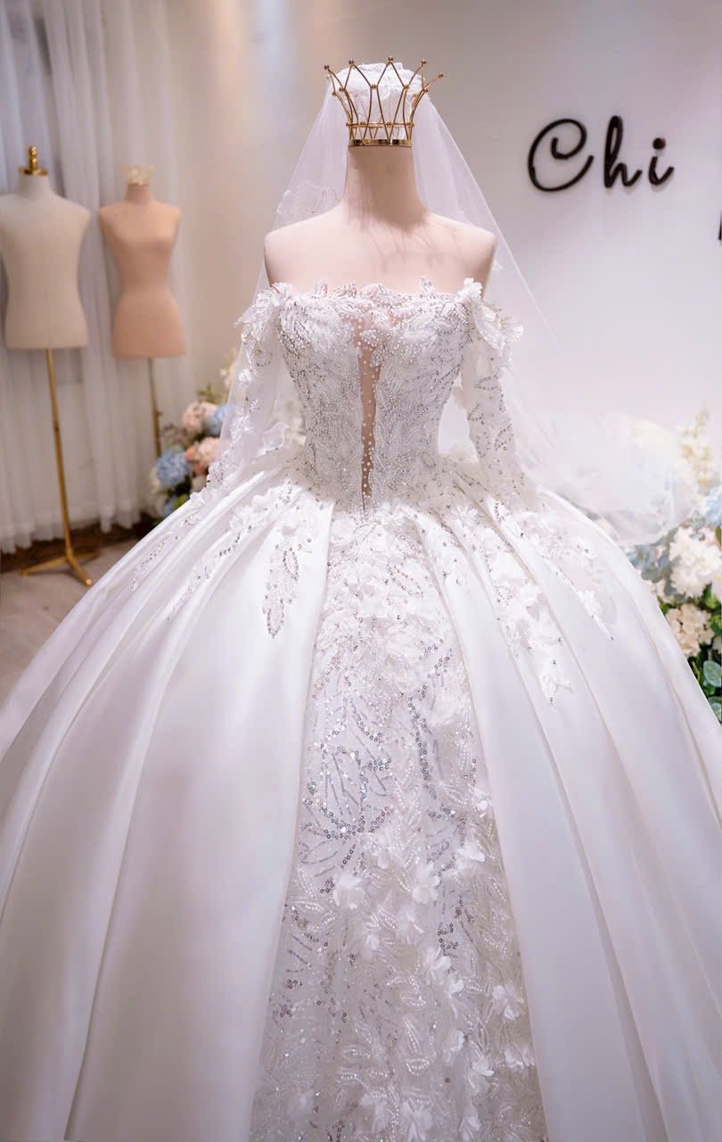 Veil: With veil Built-in bra: Built-in bra Dress fastening: Lace up Neckline: Off – shoulder / sweetheart neckline Silhouette: Ballgown Skirt Length: Floor-length Sleeve: LONG sleeves Brand: Chi Chi Paris Collection