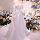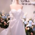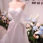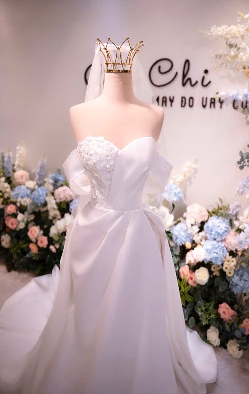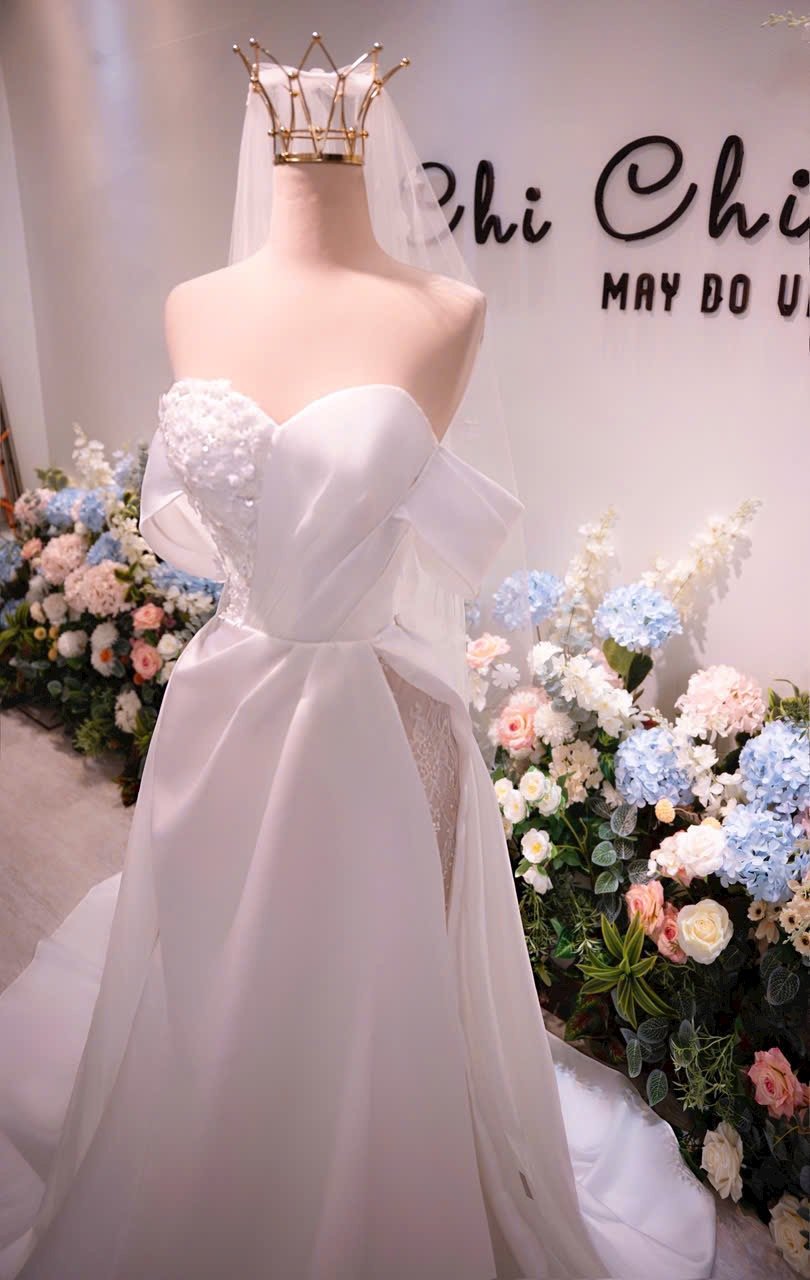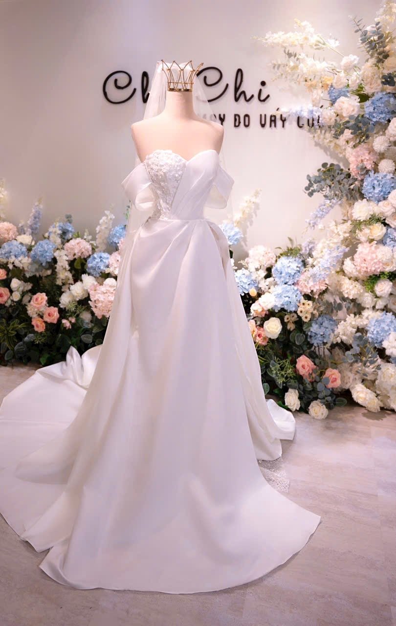 Color: Ivory/Nude Veil: With veil Built-in bra: Built-in bra Dress fastening: Lace up Neckline: Off – shoulder Silhouette: Trumpet Skirt Length: Floor-length Sleeve: Long Off – shoulder Brand: Chi Chi Paris Collection