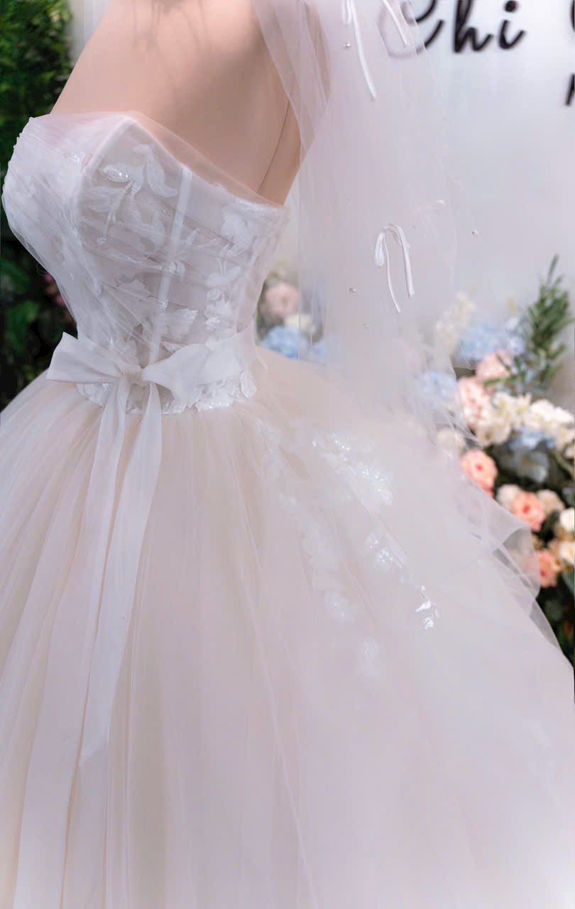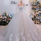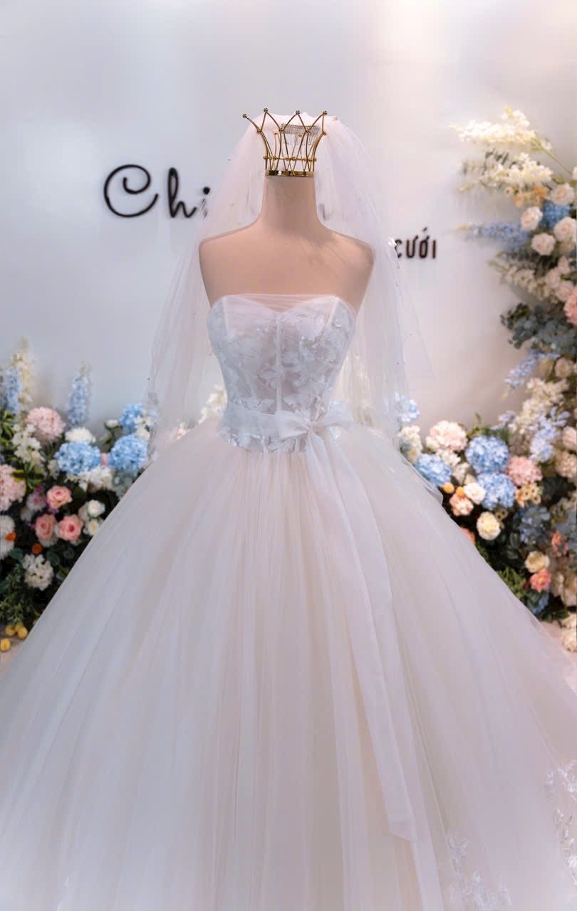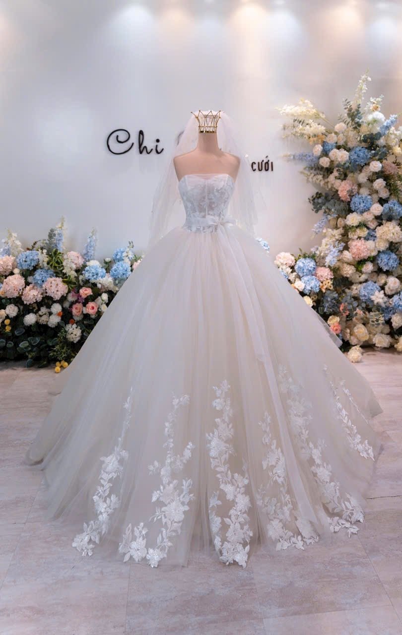 Color: Ivory Veil: With veil Built-in bra: Built-in bra Dress fastening: Lace up Neckline: V-neck Silhouette: Ballgown Skirt Length: Floor-length Sleeve: NO Brand: Chi Chi Paris Collection