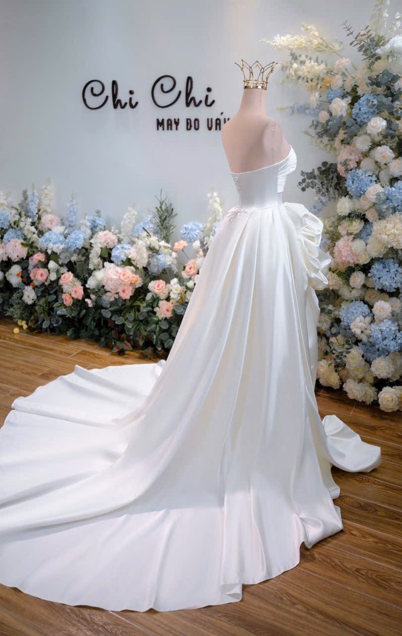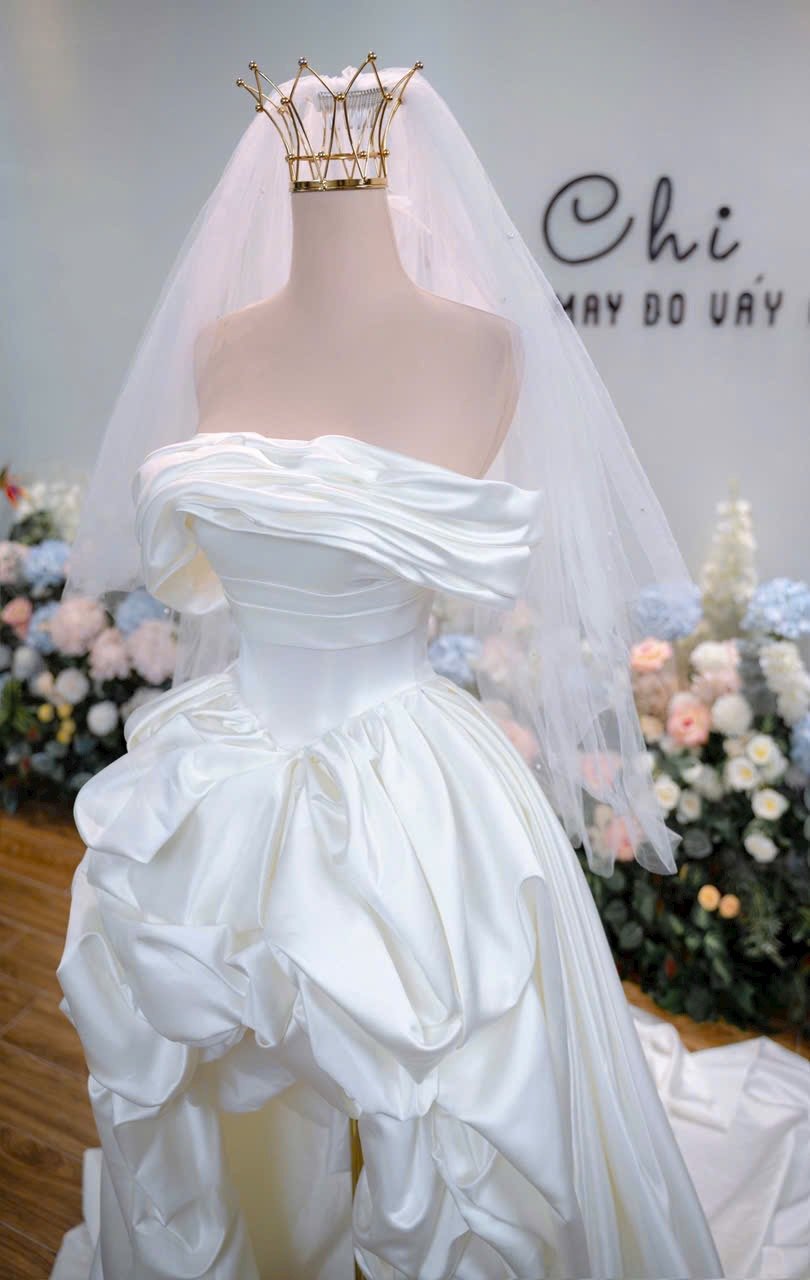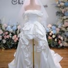 Color: White Ivory Veil: With veil Built-in bra: Built-in bra Dress fastening: Lace up Neckline: Off – shoulder Silhouette: Ballgown Skirt Length: Floor-length Sleeve: NO Brand: Chi Chi Paris Collection
