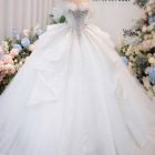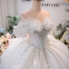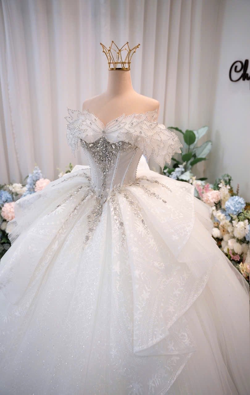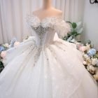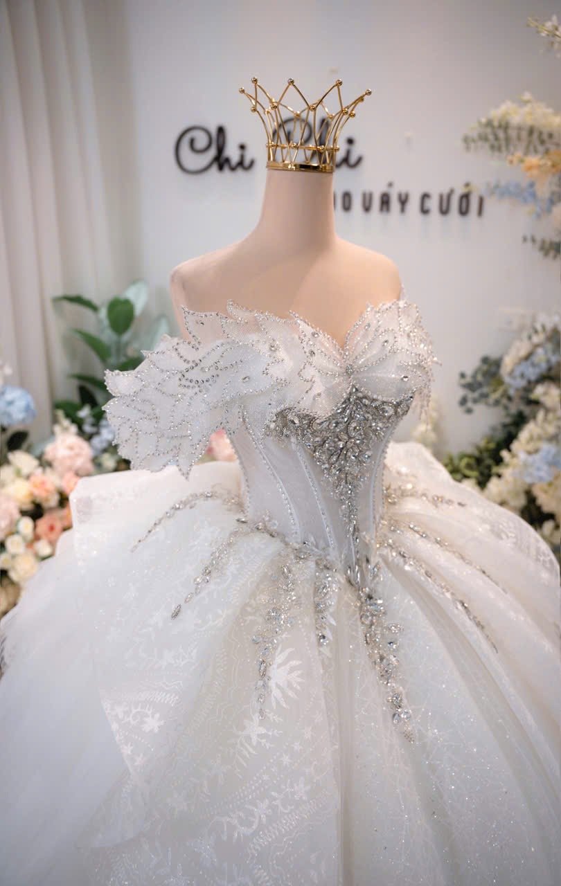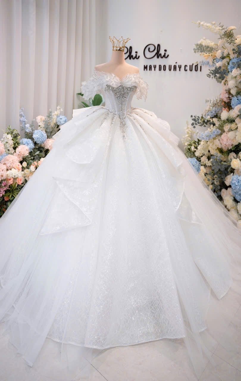 Veil: With veil Built-in bra: Built-in bra Dress fastening: Lace up Neckline: Off – shoulder Silhouette: Ballgown Skirt Length: Floor-length Sleeve: Short Off – shoulder Brand: Chi Chi Paris Collection