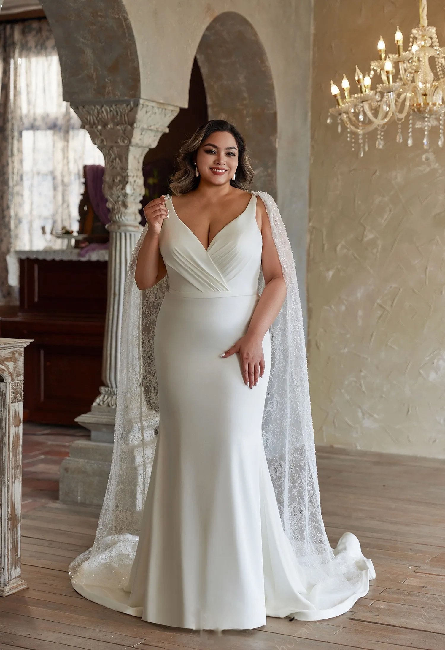 Embrace your curves in this exquisite plus – size wedding dress. The sleek fit and flare silhouette hugs your figure beautifully, while the deep V – neckline adds a touch of allure. The unique pleat design at the top flatters the figure. Lace cape brings a dash of ethereal charm, perfect for brides seeking both elegance and uniqueness. Walk down the aisle with confidence, as this gown celebrates your beauty in every way.