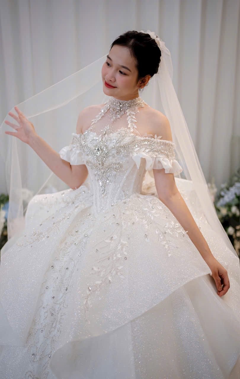 The Juliet Veil gown is a stunning A-line silhouette adorned with delicate lace overlays. Its romantic flow and subtle sparkle make it perfect for garden weddings and elegant indoor ceremonies alike.