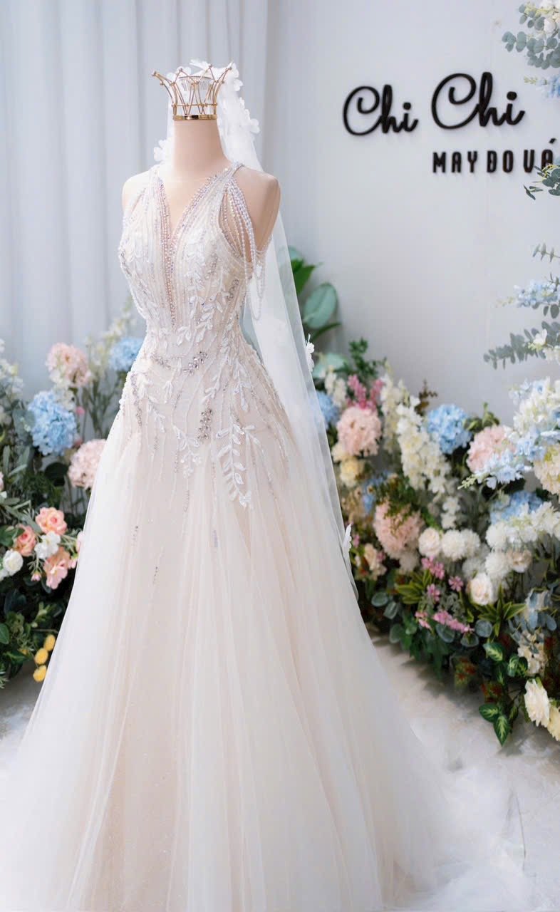 Kaia Glow is the essence of boho romance. Flutter sleeves, floral embroidery, and a light train make this gown ideal for beach and rustic weddings.