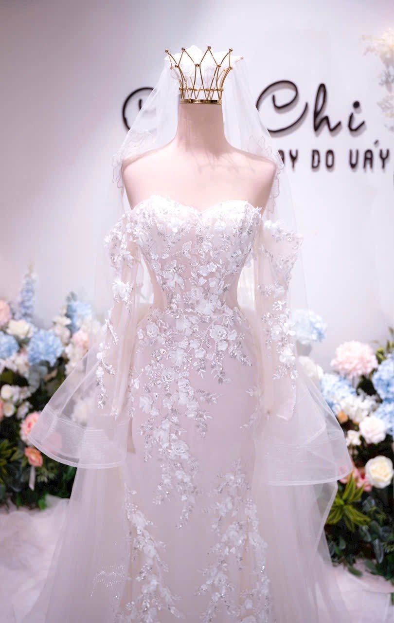 Ethereal chiffon gown with draped sleeves and flowing hemline.