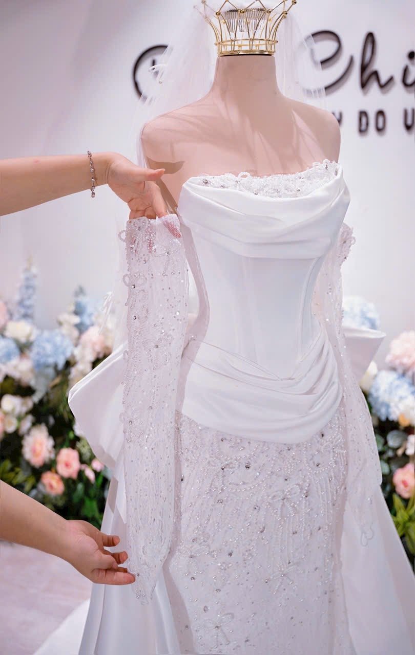 Nerissa Whisper exudes sophistication with its clean lines and structured bodice. This modern masterpiece is ideal for the minimalist bride seeking timeless style.