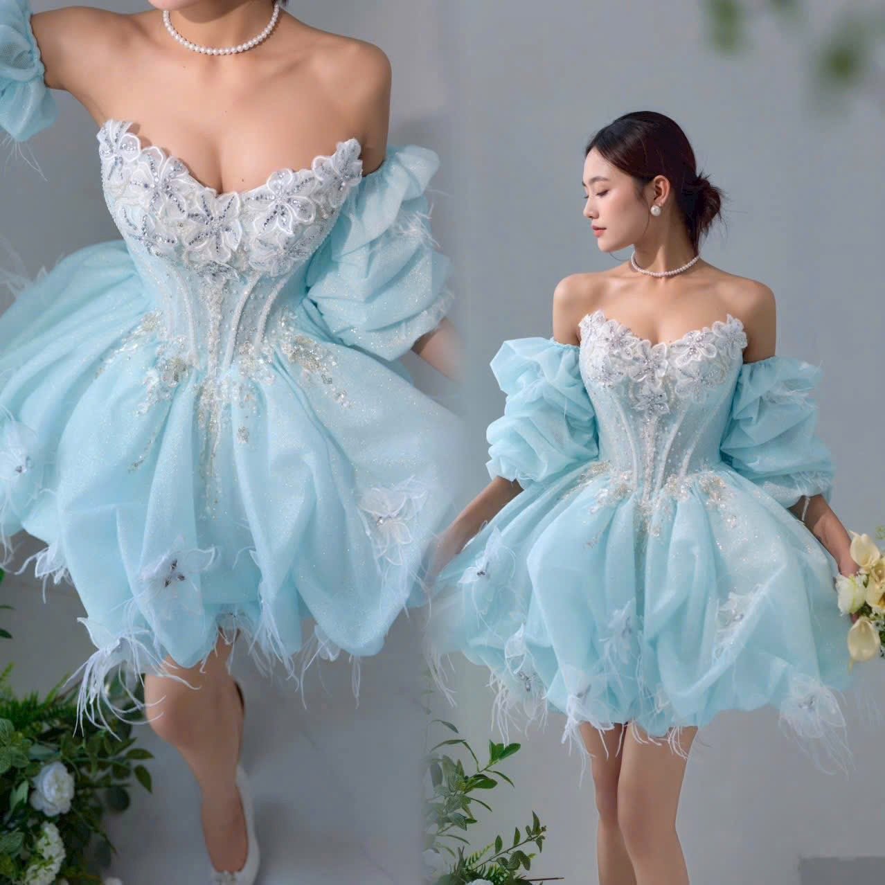 Color: Light blue Veil: No Built-in bra: Built-in bra Dress fastening: Lace up Neckline: V-Neck Silhouette: Short Aline Skirt Length: Short Sleeve: Short Off Shoulder Brand: Diana New York Collection
