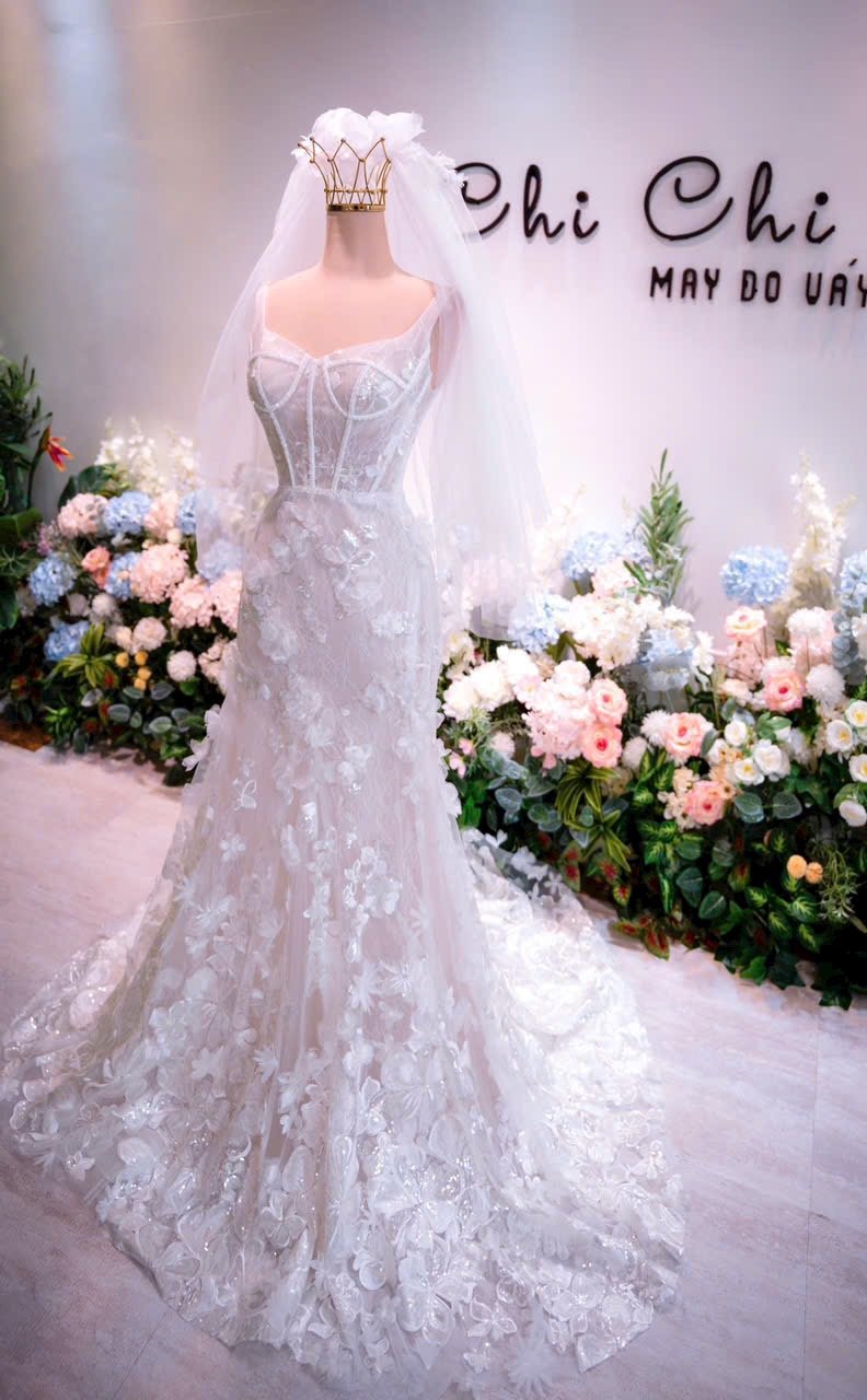 Ethereal chiffon gown with draped sleeves and flowing hemline.