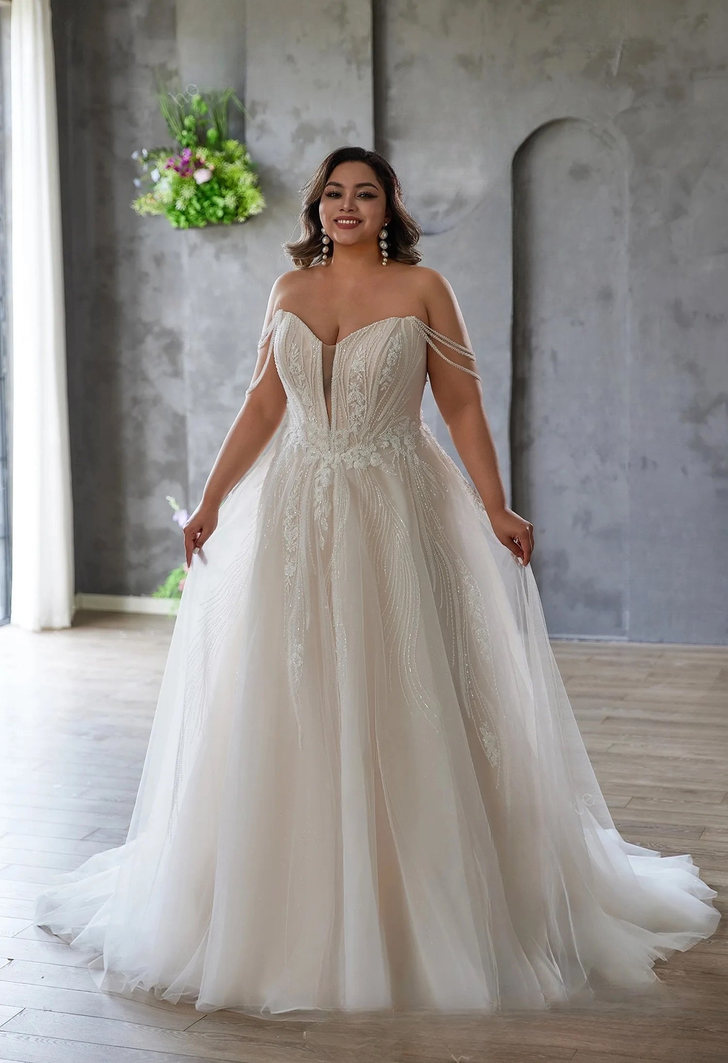 For the bride who dreams of a blend of elegance and ethereal charm, this plus – size wedding dress is a masterpiece. The subtlety bodice, adorned with intricate floral lace and delicate sequins, hugs your curves in the most flattering way. The deep V – neckline and sleeveless design add a touch of sophistication, while the flowing tulle skirt creates a dreamy silhouette. Every detail, from the lace – covered back to the subtle shimmer of the tulle, is crafted to make you feel like a princess on your special day.