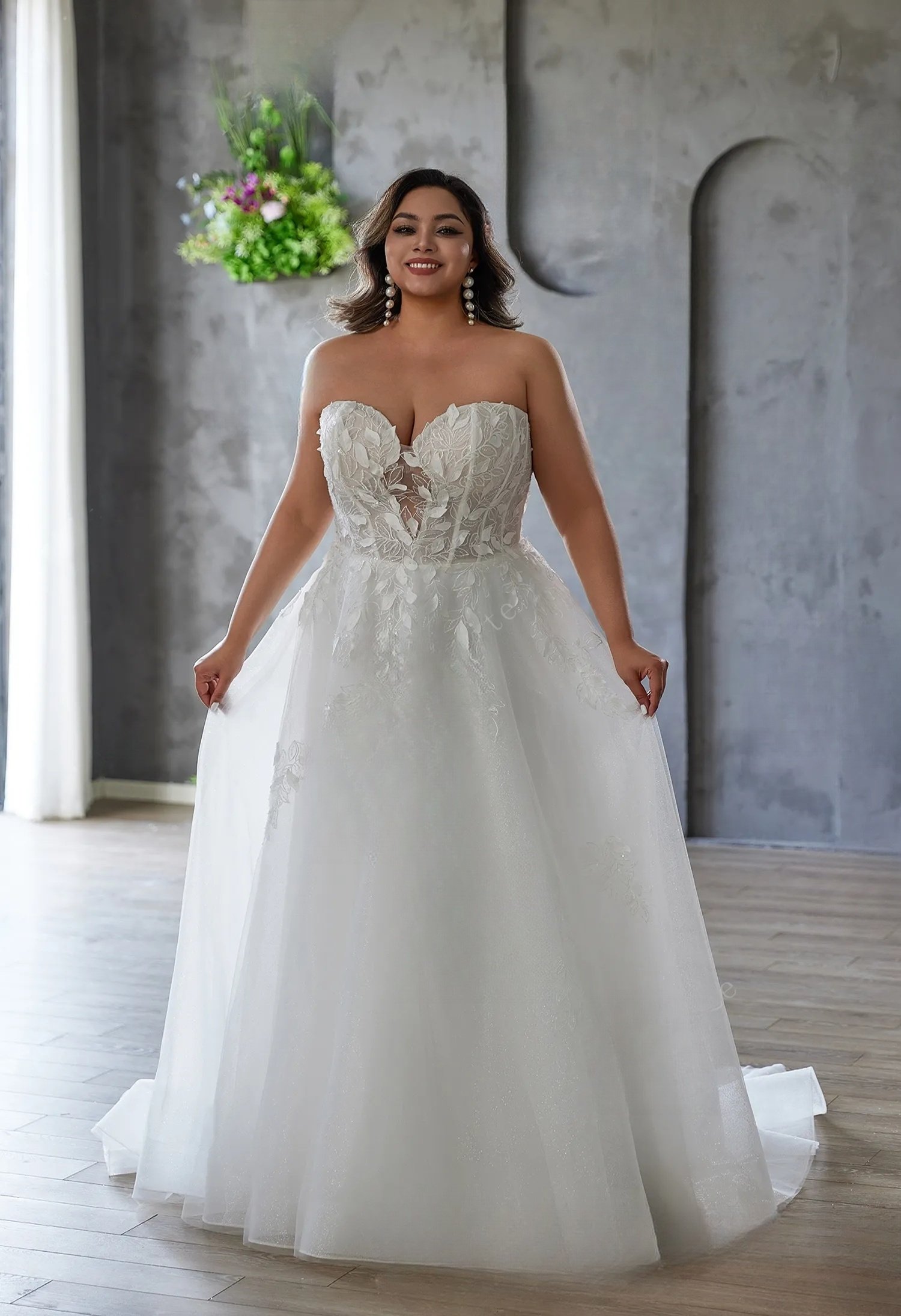 Unveil your dream bridal look with this HW3674. The strapless sweetheart neckline exudes romance, framed by a bodice adorned with intricate 3D floral lace appliqués and sheer illusion details, adding allure. Sleeveless design highlights elegance, while the voluminous tulle skirt, sprinkled with subtle shimmer, flows gracefully. Delicate leaf – like lace cascades from the bodice to the skirt, creating a seamless blend of structure and softness. Perfect for brides seeking a mix of classic charm and modern artistry—let this gown make your walk down the aisle a fairytale moment.
