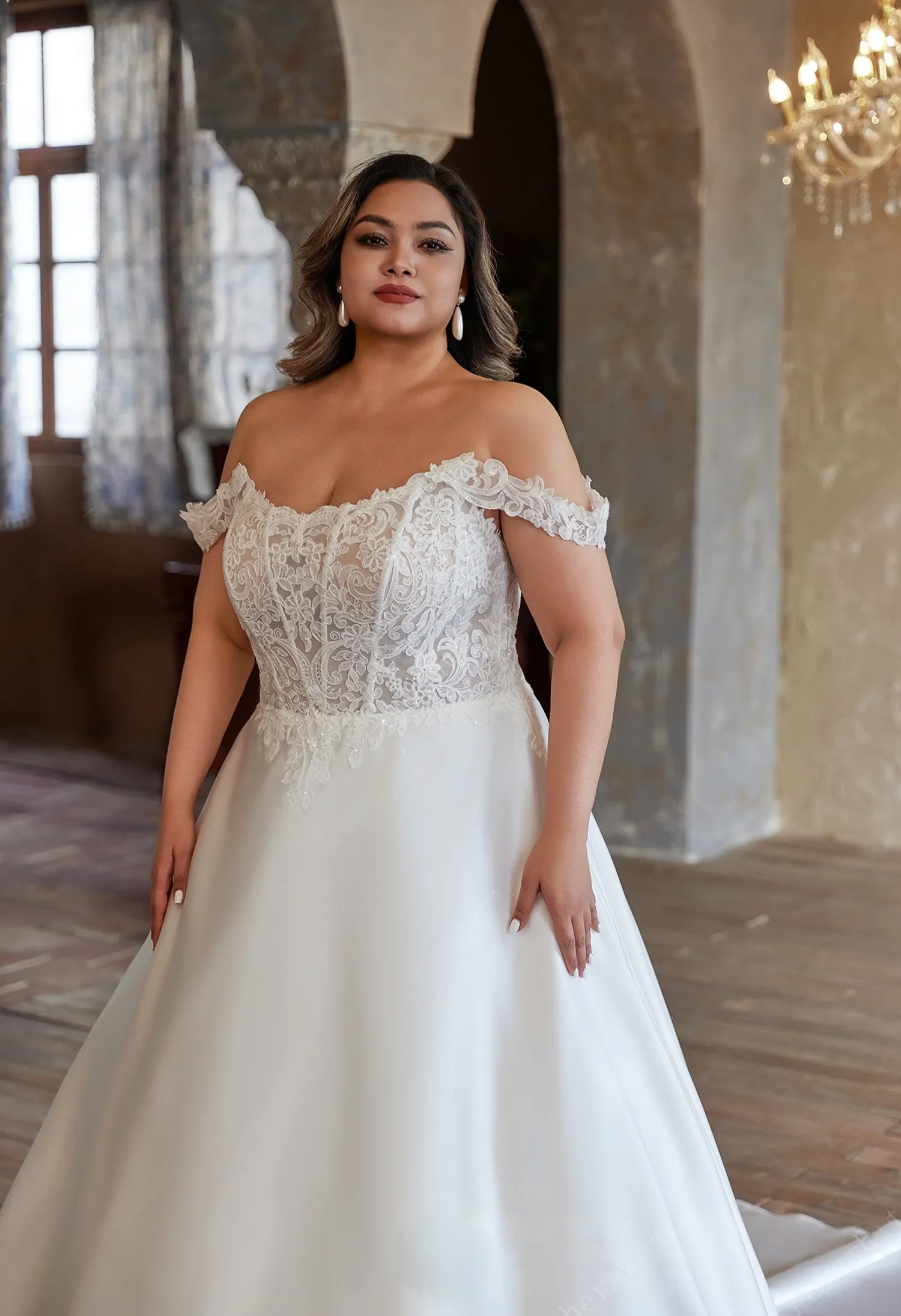 This plus-size wedding dress is a dreamy blend of romance and elegance. The scoop neckline compared with off shoulder straps, adorned with intricate lace, frames your shoulders beautifully, while the sheer lace bodice adds a hint of delicate allure. The lace is arranged in a V-shape at the waist, which makes the waist visually tighter and more slimming.The flowing satin skirt creates a regal silhouette, and pairing it with a veil (optional) completes the timeless bridal look. It’s designed to celebrate every curve, making you feel like the most radiant bride on your special day.